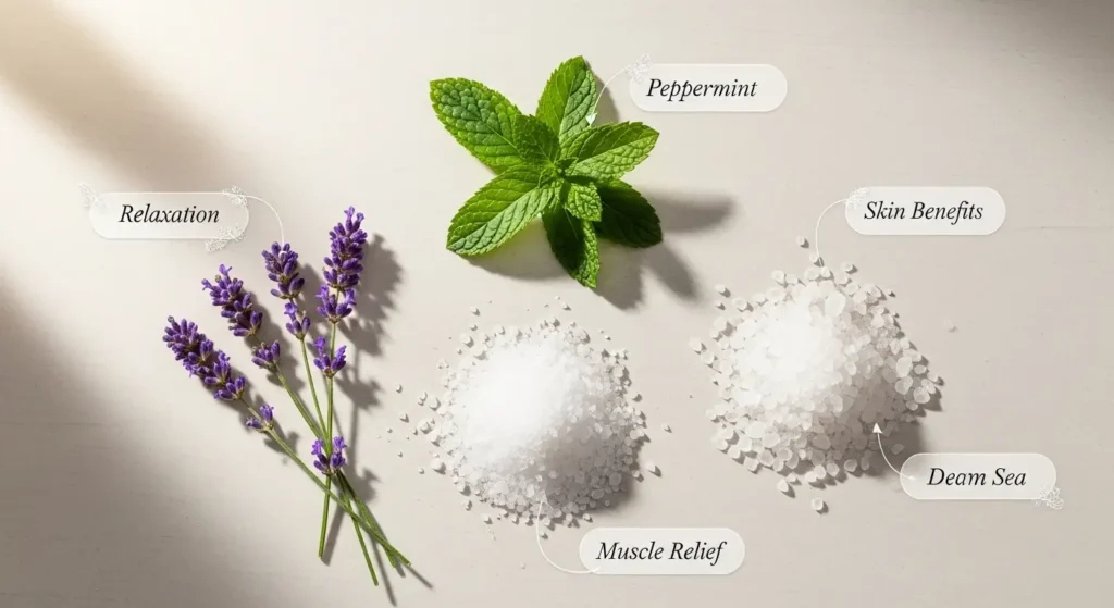 Epsom Salt: Contains magnesium sulfate, aiding in muscle relaxation and stress reduction. Timeline+12Byrdie+12Gravity Fitness Equipment+12