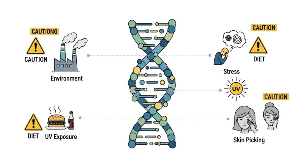 Genetics gives 60% of the skin picture; the other 40% comes from sun exposure, diet, stress, sleep, and lifestyle. Dermatologists note that recommendations will become more precise as research evolves.